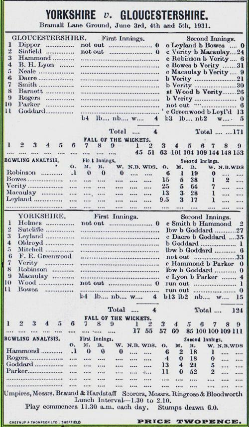 Bev had no time for defensive tactics and once, in a match against Yorkshire when Gloucester had already batted and made over 500 in a single day, he told Percy Holmes, the Yorkshire skipper, that he would give £5 every time a Yorkshire player hit the ball out of the ground. First man in for Yorkshire was Herb Sutcliffe who, according to Bev, “had never hit a six in his life before.” Bev threw the ball to Wally Hammond to open the bowling and Sutcliffe opened his shoulders and hit the very first ball into the pavilion! Then, turning to Bev, he said: “Was that all right, then?” He went on to score 135. But for Bev Lyon to lose a gamble was most unusual. Newspaper headlines of the day were full of acclaim for his bold declarations in the interests of brighter cricket. One of these also in a match between Gloucestershire andYorkshire set a precedent in first-class cricket, enabling a three-day match to be finished in one day after the first two days’ play had been washed out. To quote “We sat up all night working out the legal implications,” says Bev, “and when we batted first next day, Robinson bowled one ball which was purposely allowed to go for 4 byes. I then declared at four for no wicket, and Hammond bowled four byes to the first Yorkshire batsman whereupon they declared. So it became a one-innings match with everything to play for.” Gloucester went on to win the match by 47 runs. One cricket writer called it “the most remarkable game ever played."