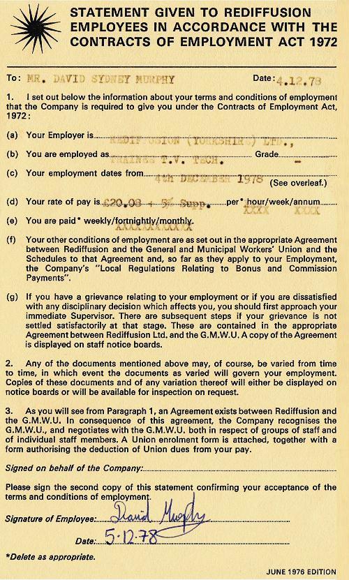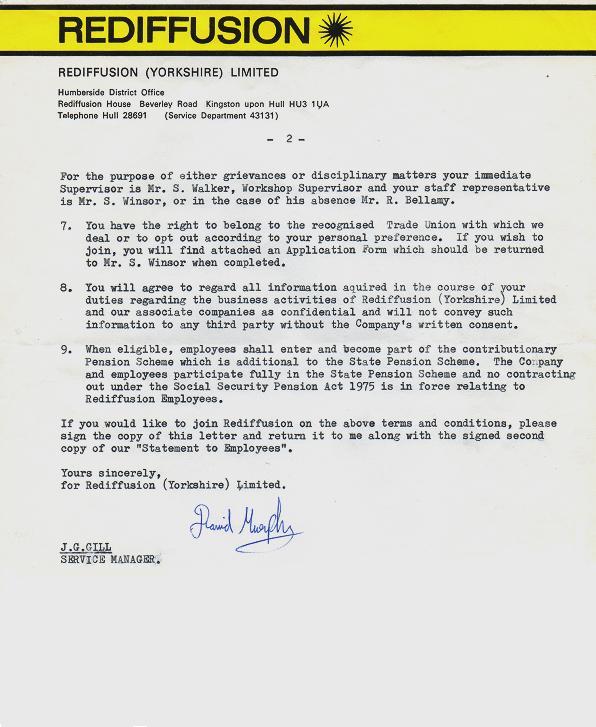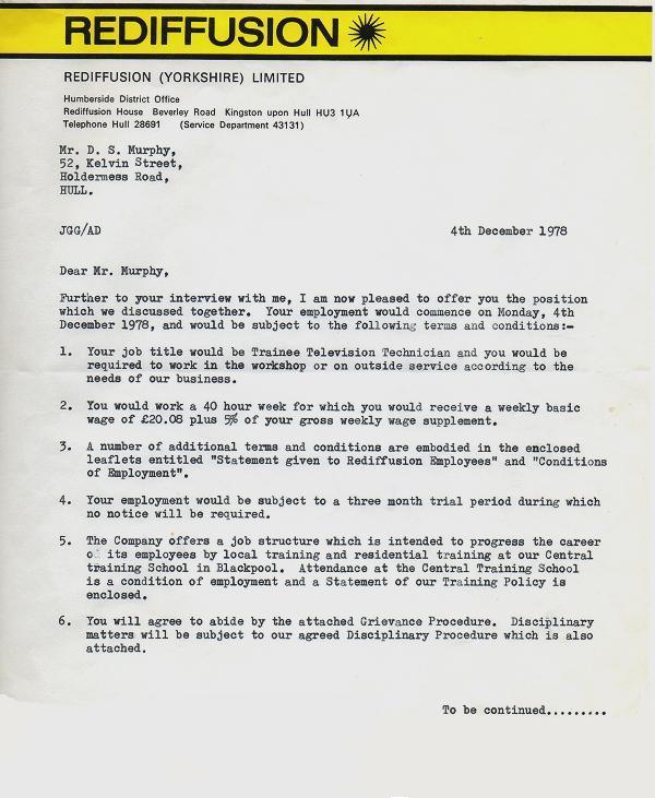 This page contains copies a letter offering Dave Murphy employment as a TV Tecnician and