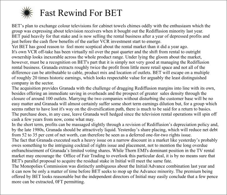 The end of an era began in 1984 when BET, the group parent company sold the Rediffusion Television rental business to Granada.